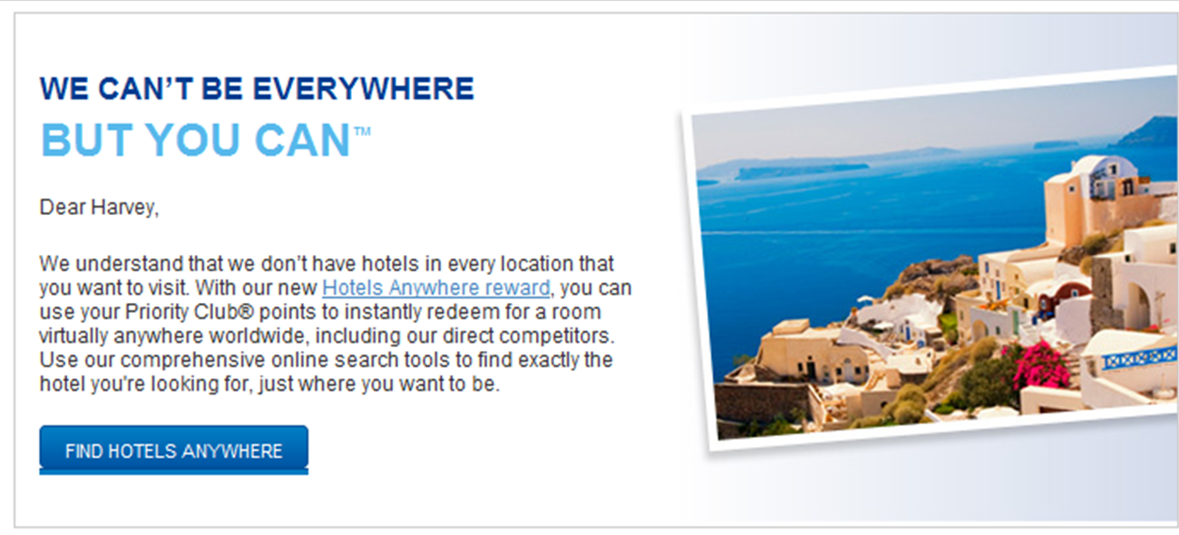 As a Priority Club member (their loyalty program) I was surprised to receive the following e-mail this month: