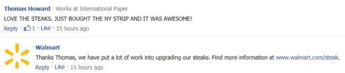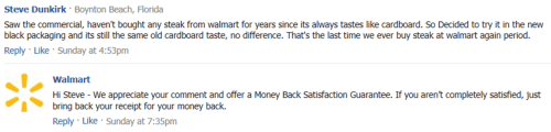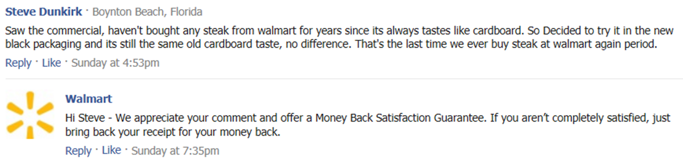 The money-back guarantee is a potent tool to assuage unsatisfied shoppers, which Walmart’s social media team relies on heavily. Just to give you a flavor of the Facebook steak dialogue, here are two recently posted examples: