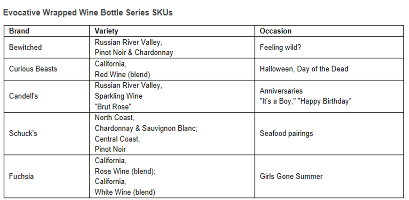 The line of wines is called Evocative Wrapped Bottles, and includes five variants or “brands” as the company refers to them that “are designed to tell a story, give a recipe, or celebrate a special occasion.”