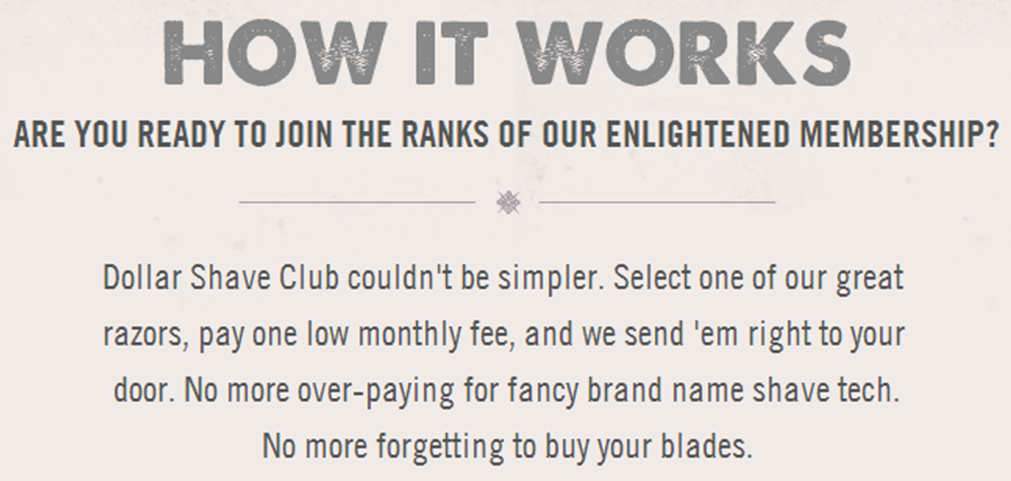 An opening existed for a competitor to deliver a high-quality blade at much lower cost, and it came via a new business model.  Dollar Shave Club (DSC) emerged as a disruptive player in 2011/2012, getting wide notice with a wacky video featuring its founder.  Its online, recurring monthly sales model (“club”) took dead aim at the category giants selling through traditional retail channels.