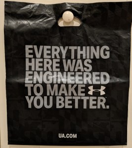 The slogan on the bag fits perfectly with the company’s mission, abbreviated as “Under Armour makes you better;” and in longer form: “Under Armour’s mission is to make all athletes better through passion, design and the relentless pursuit of innovation.”